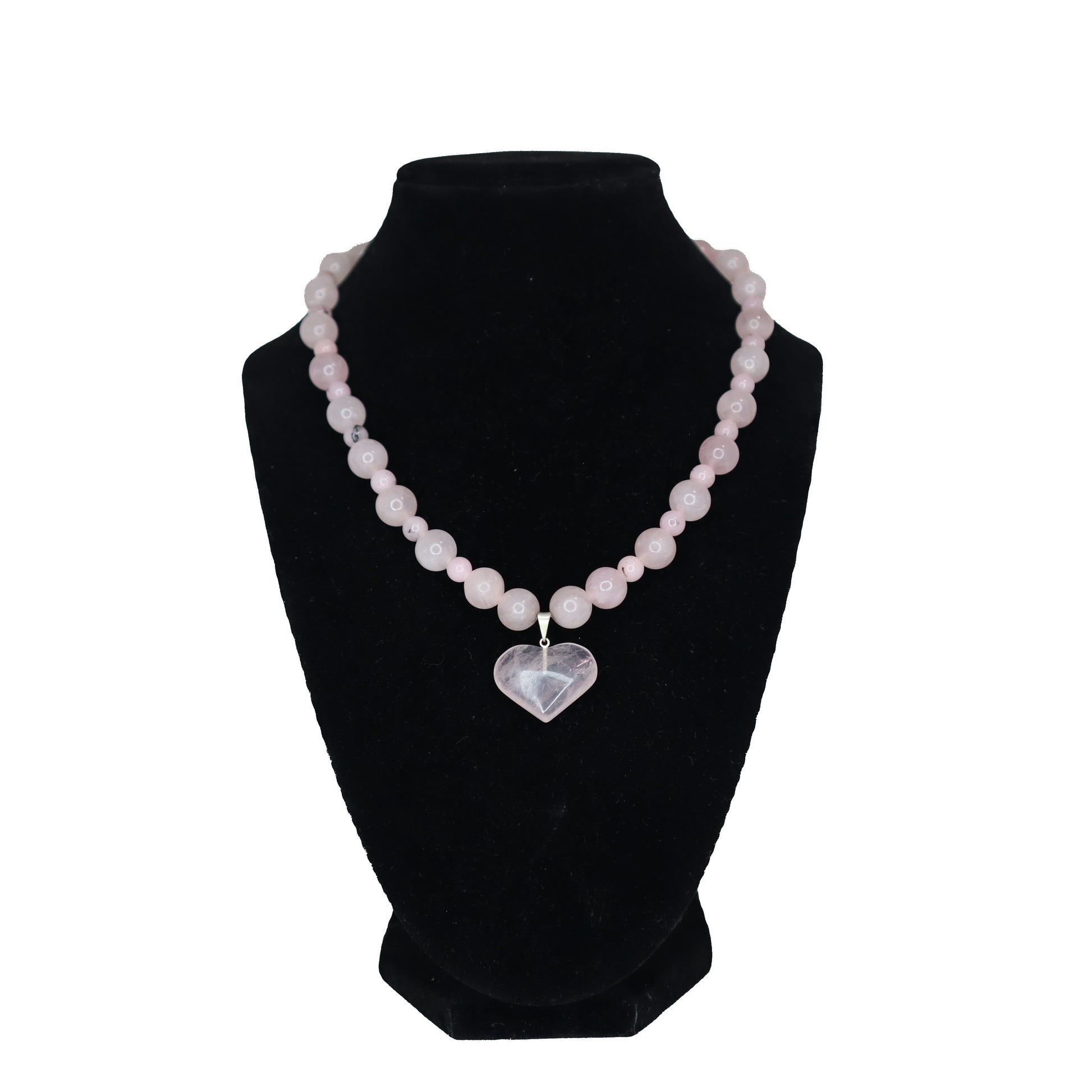 This handcrafted 45cm necklace pairs rare 6mm beads of tourmalinated pink quartz, a unique blend of pure rose quartz with small distinct pure black tourmaline inclusions, with larger 10mm beads of pure rose quartz, centered by a polished rose quartz heart. Rose quartz opens the heart to love and healing, while tourmalinated rose quartz grounds and protects. A symmetrical design that reflects harmony, beauty, and divine feminine energy.